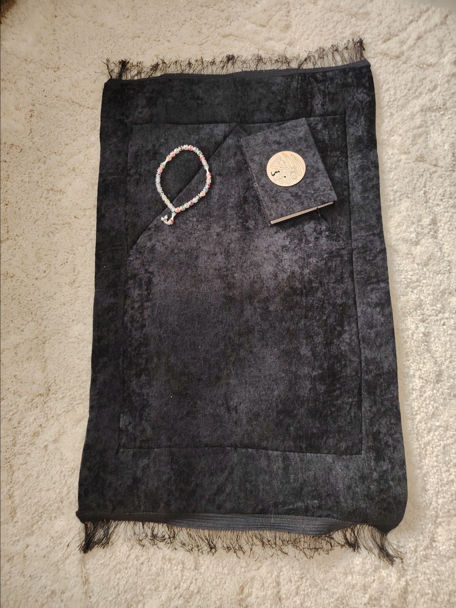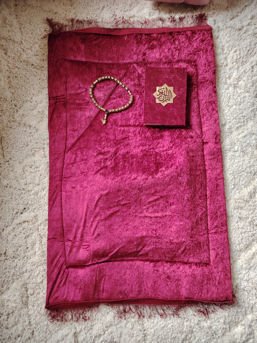 2. سجادة صلاة مريحة جدًا: مصنوعة من القطيفة الفاخرة ومبطّنة بالإسفنج الطبي عالي الجودة، بتصميم أنيق ومميز.