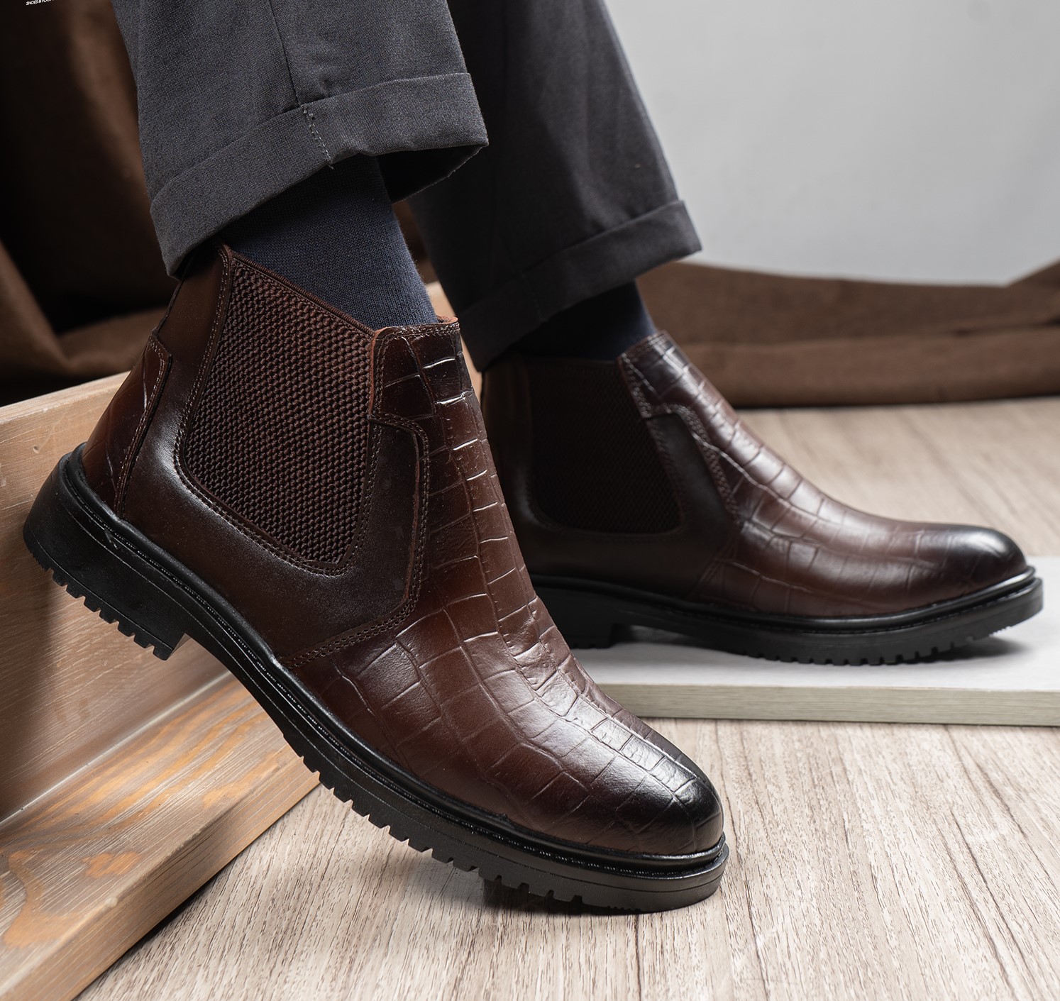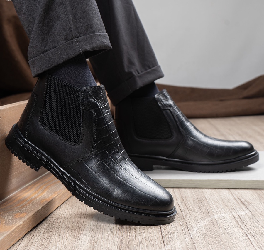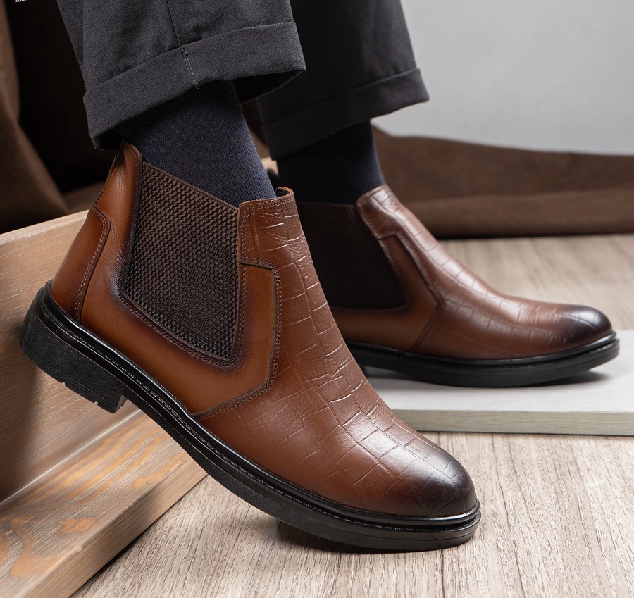 هاف بوت رجالي جلد طبيعي بتصميم جلد تمساح مع نعل رابر مرن وفرش سيليكون مريح، أناقة وراحة تدوم بمقاسات 40-47.